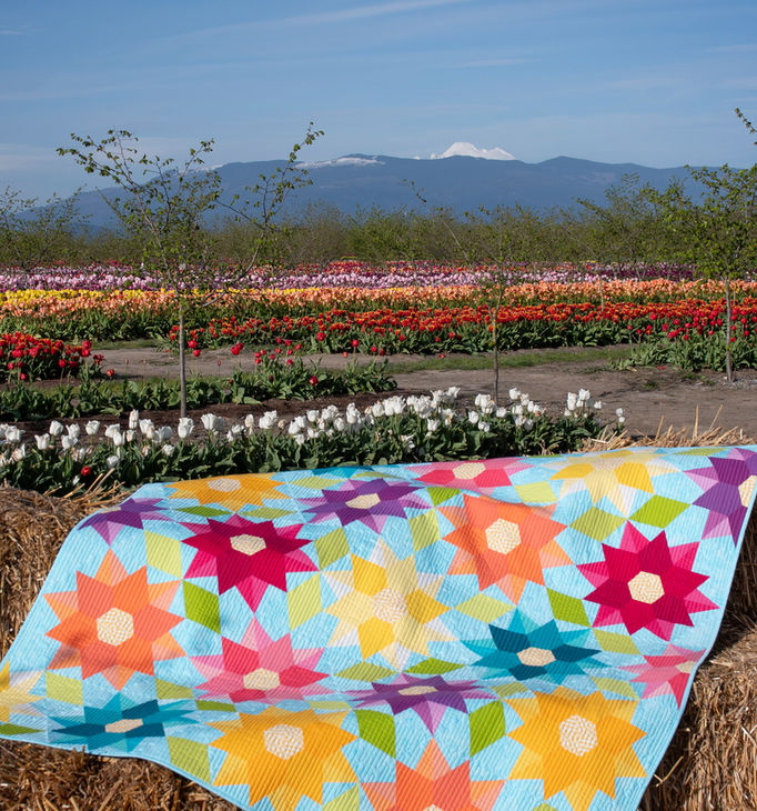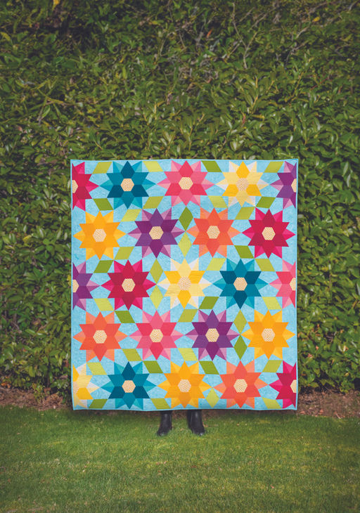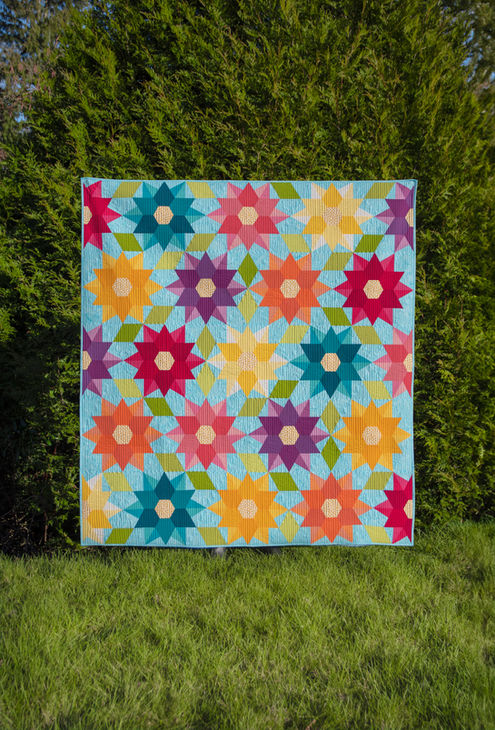 Gain confidence with angles and color placement, plan out curated flower shades, or use scraps from your stash for an eclectic look! Dancing Dahlias will give you a complicated look without tedious piecing. It is constructed of two main blocks, the flower blocks, and the leaf blocks, with side setting units that make construction a breeze with no Y seams. Each block illustrates a different technique using the Creative Grids 60-Degree Diamond TINY Ruler.