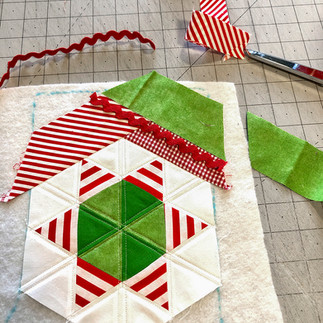 I kept building the stocking front, strip by strip, to fill in the stocking outline above the block. For the next round, I added a piece of rick-rack tucked in the seam. I stitched the rick-rack down first, then went over the top of it with the green strip covering the first stitch line.
