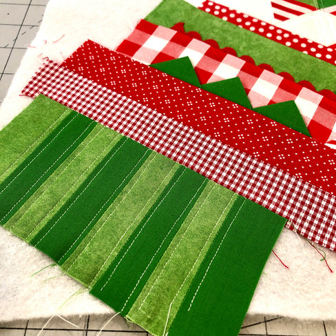 As I filled up the space at the bottom part of the stocking, I thought it would be fun to add a few little prairie points! I cut three 2” squares and pressed them in half diagonally, then folded those triangles in half once more to create smaller triangles.