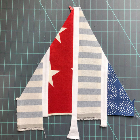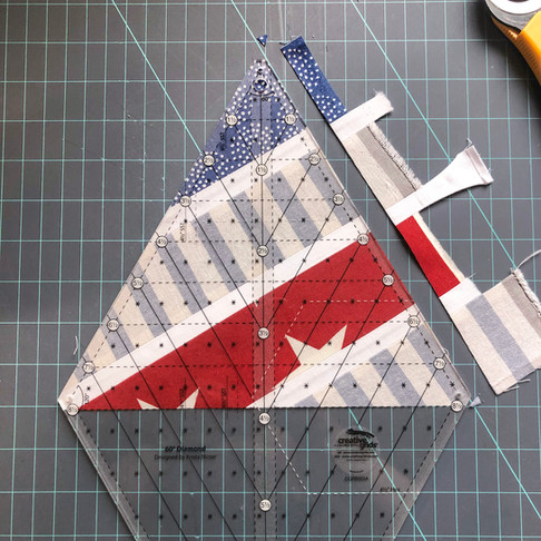 Once the two sides were pieced together, I laid the triangle side of the Large 60-Degree Diamond Ruler down with the dashed center lines going up the middle. I was aiming for an 8 ½” triangle, so I made sure to scoot the ruler close to the tip of the triangle to get the biggest triangle possible. Trim on both sides of the ruler.