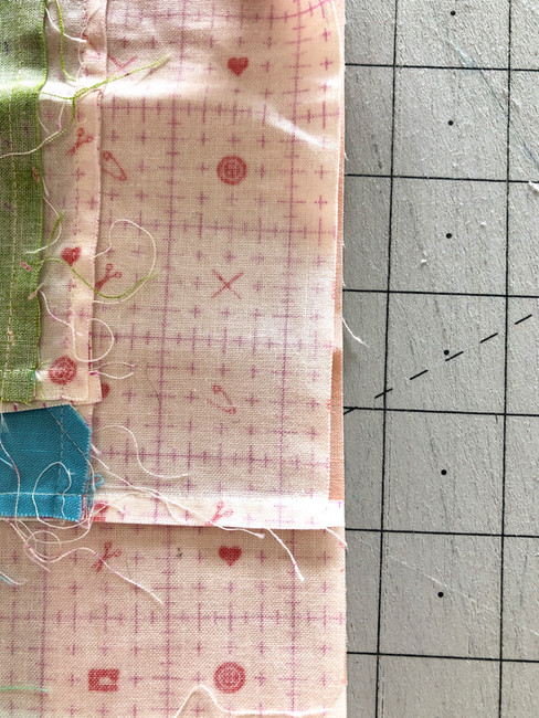 This little patchwork block is supposed to be 10½” square, but it actually came out closer to 10⅝” square. I needed to trim off 1/16" from each side for a total of ⅛” adjustment.