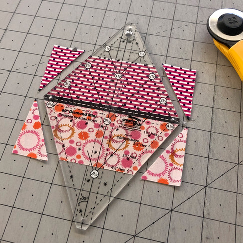 This week, I was tinkering with a new idea using up scraps of Jen Kingwell’s Lollie fabrics (they have a black line to separate prints every 5”). I cut 4½” x 5¼” rectangles with the black line going the long way right through the middle. I centered the Mini Ruler over the rectangle, lining up the 4½” hexagon lines along the top and bottom. I cut split hexagons with one print on one half and the other print on the other half. I cut a pile of these with big plans to make a super cute spring colored quilt!